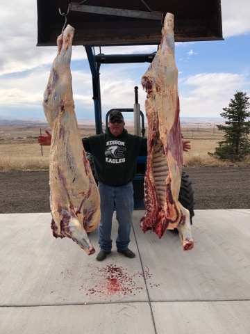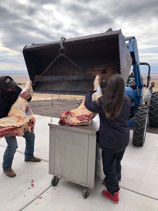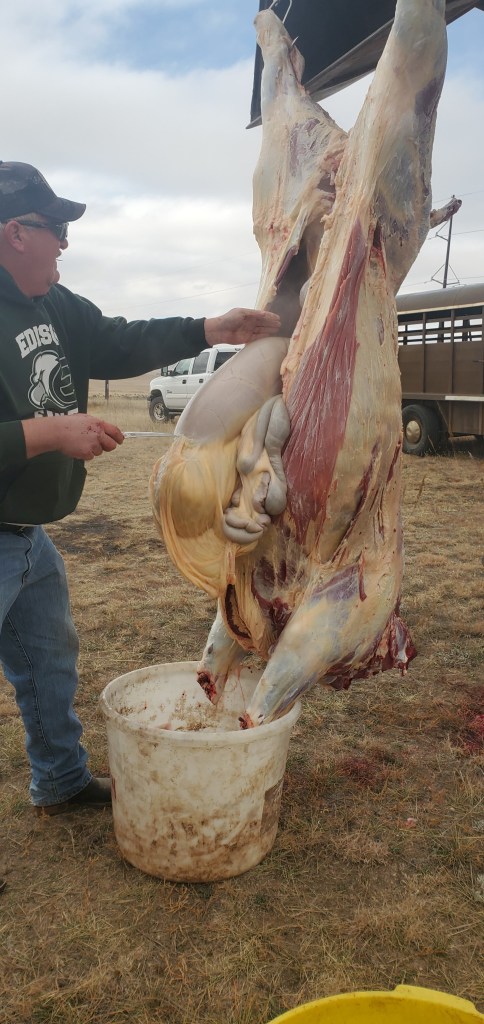 This steer was born and raised right on my husband’s family ranch. We delivered it to my parents to get him dressed and in the cooler to hang until we are ready to process him. He will hang in the cooler until Thanksgiving time, when we can get back up to my parents’ to help butcher.